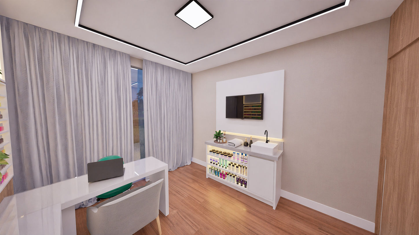 Esse é um projeto de uma clínica de podologia, um espaço compacto de 10m² que combina funcionalidade e conforto. O piso de vinílico amadeirado e a mobília laqueada em branco criam um ambiente acolhedor e bem iluminado. Um dos destaques é o carrinho auxiliar, projetado para otimizar o atendimento ao paciente.